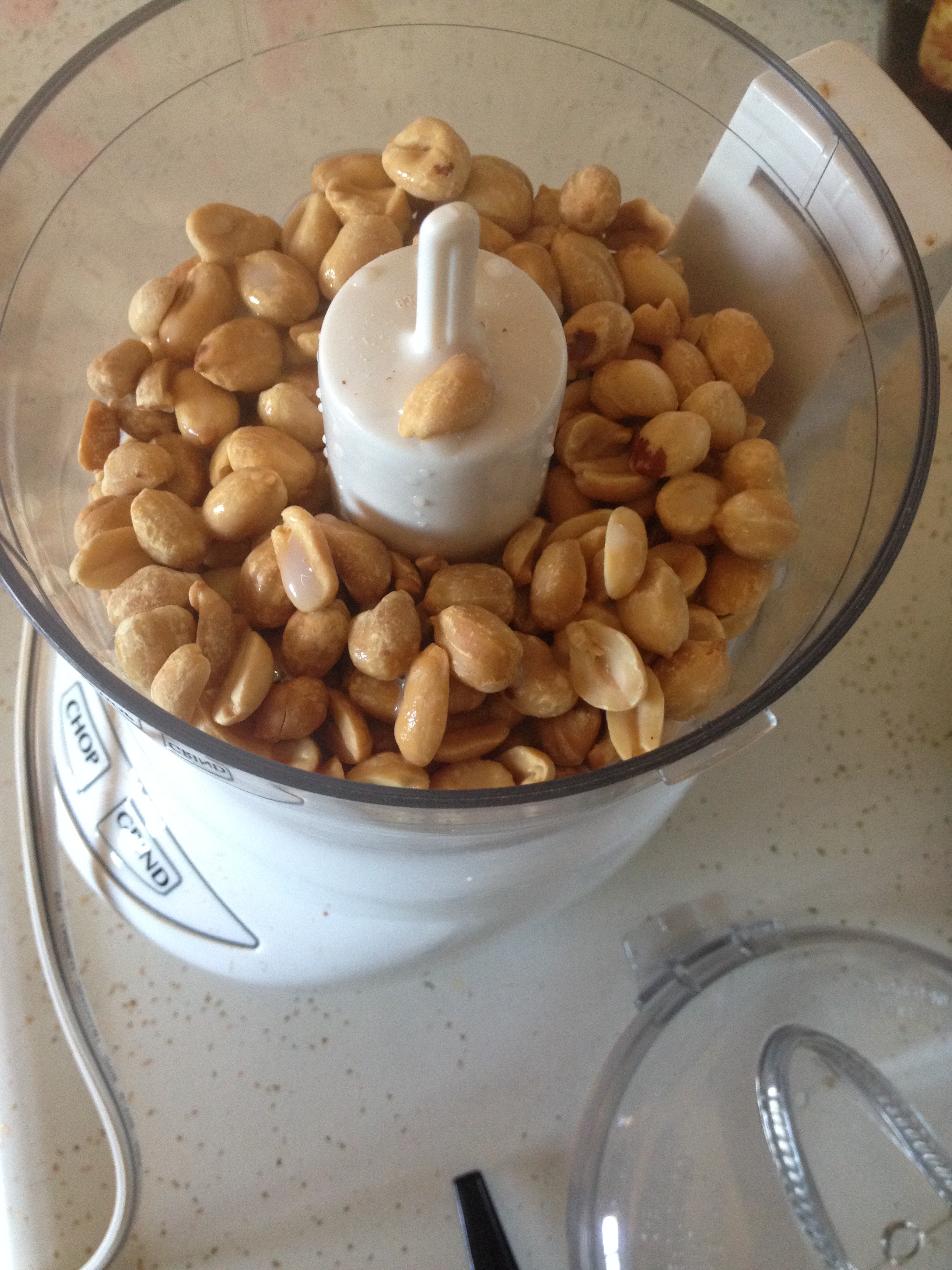 4. Let heat 3 1/2 hours then grind peanuts in small food processor with two tablespoons of the liquid in the crockpot until peanuts are buttery.