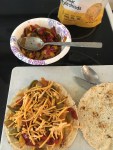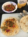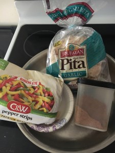 Start by defrosting the peppers completely. Once defrosted drizzle oil in a sauté pan then dump the veggies and liquid into the pay and start heating on medium heat. Sauté veggies with taco seasoning, adding water to help cook, until veggies are brown and smelling amazing. Dump into a bowl. Split a pita in half then lay the inside of the pitas in the sauté pan to brown then take out. Layer cheese and veggies then cheese again on a pita then top with the other. Place carefully into the hot pan and brown then carefully flip with a spatula and let brown. DF cheese doesn’t melt all that well, so once the bread is browned the cheese is soft then it’s good to eat. Enjoy!